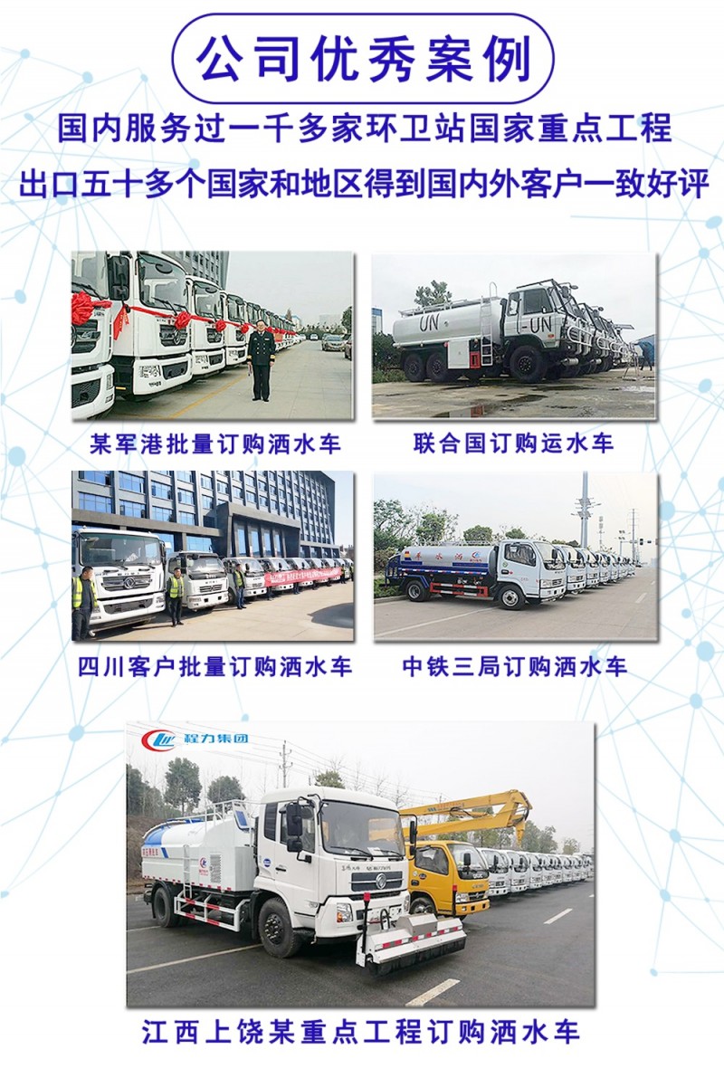 產品概述:該車型為東風公司最新國六 排放標準。灑水車專用部分由罐體、水泵、取力器、傳動軸、球閥、噴灑裝置等部件組成。采用國家定型產品,具有性能穩定、工作可靠、通用適配等特點。灑水車罐體結構為橢圓形或方圓形,采用武鋼優質碳鋼制作,先進的對焊接工藝,罐體內設防蕩防波隔板,下端有通孔,罐體成型后高壓氣體試漏檢測,使罐體具有強度高、重心穩、車輛運載安全平穩等特點。