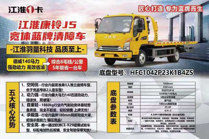 江淮J5清障車,2噸上裝,4噸卷揚,20米鋼絲繩,有三種板面可選,一體板3.8+1.3=5.1米左右,寬2.3米,雙側(cè)聯(lián)動操作,配警燈喊話器一5套.輔助小車一套,四根捆綁帶,底盤合格證,整車合格證,